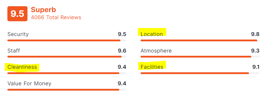 두 번째는 평점입니다. 호스텔월드에서는 평점을 제공하는데 제게 의미 있었던 평가 요소에 대해 살펴보려고 합니다.