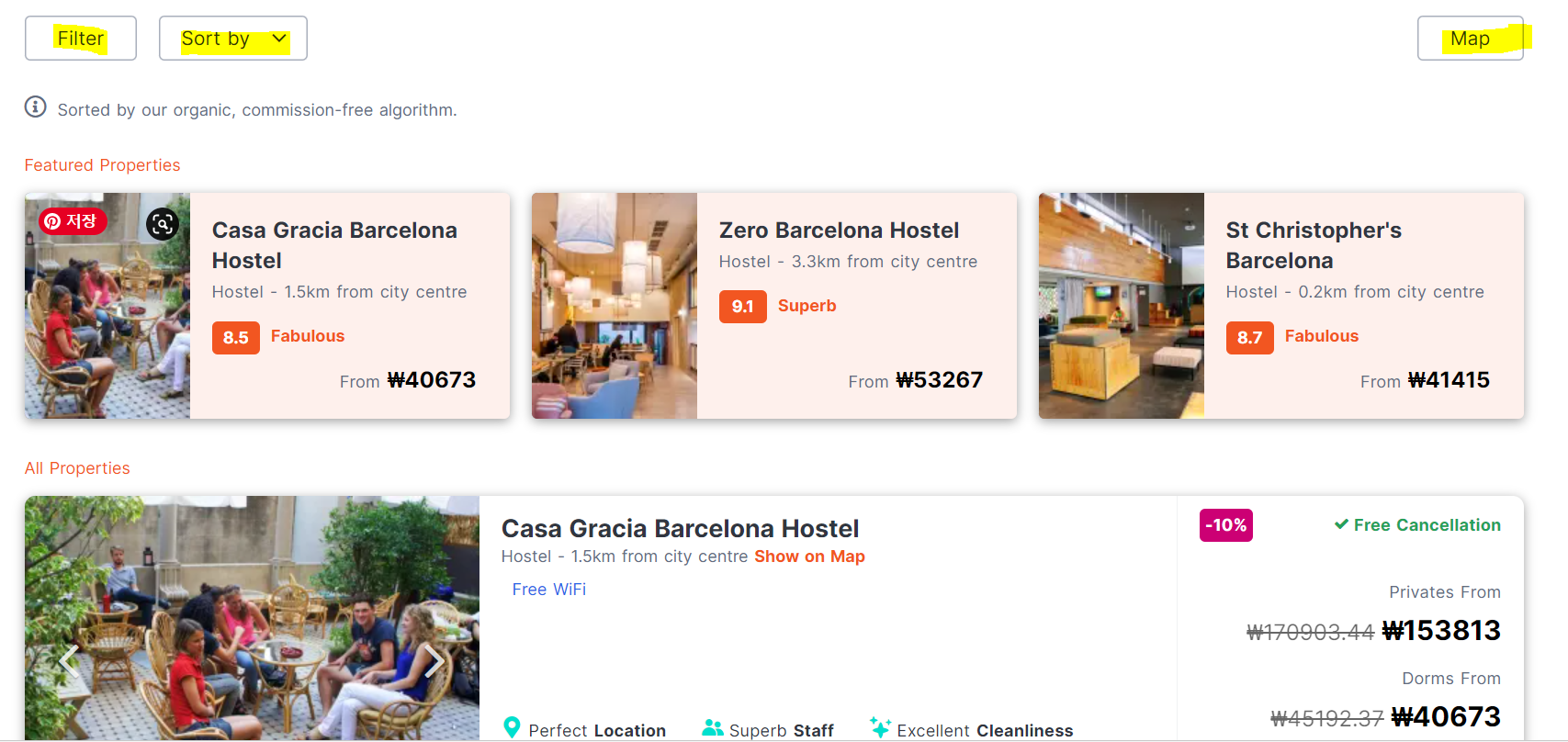 그러면 위와 같이 검색 결과가 뜰겁니다. 필요에 따라서 상단 좌측의 필터를 쓰시거나 상단 우측의 지도로 볼 수도 있습니다. 보통 평점 높고 인기 좋은 호스텔들이 가장 위에 나오니까 그대로 쭉 내리며 살펴보셔도 무난합니다. 호스텔들을 클릭하며 살펴보시면서 크게 볼 건 두 가지인데 사진들과 평점들입니다.